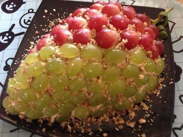 Теперь финальный штрих - чтобы виноградинки хорошо легли, смазываем всю поверхность. Виноградины разрезаем на половинки, вынимаем косточки (если они есть) и укладываем в шахматном порядке, так они лучше лягут.