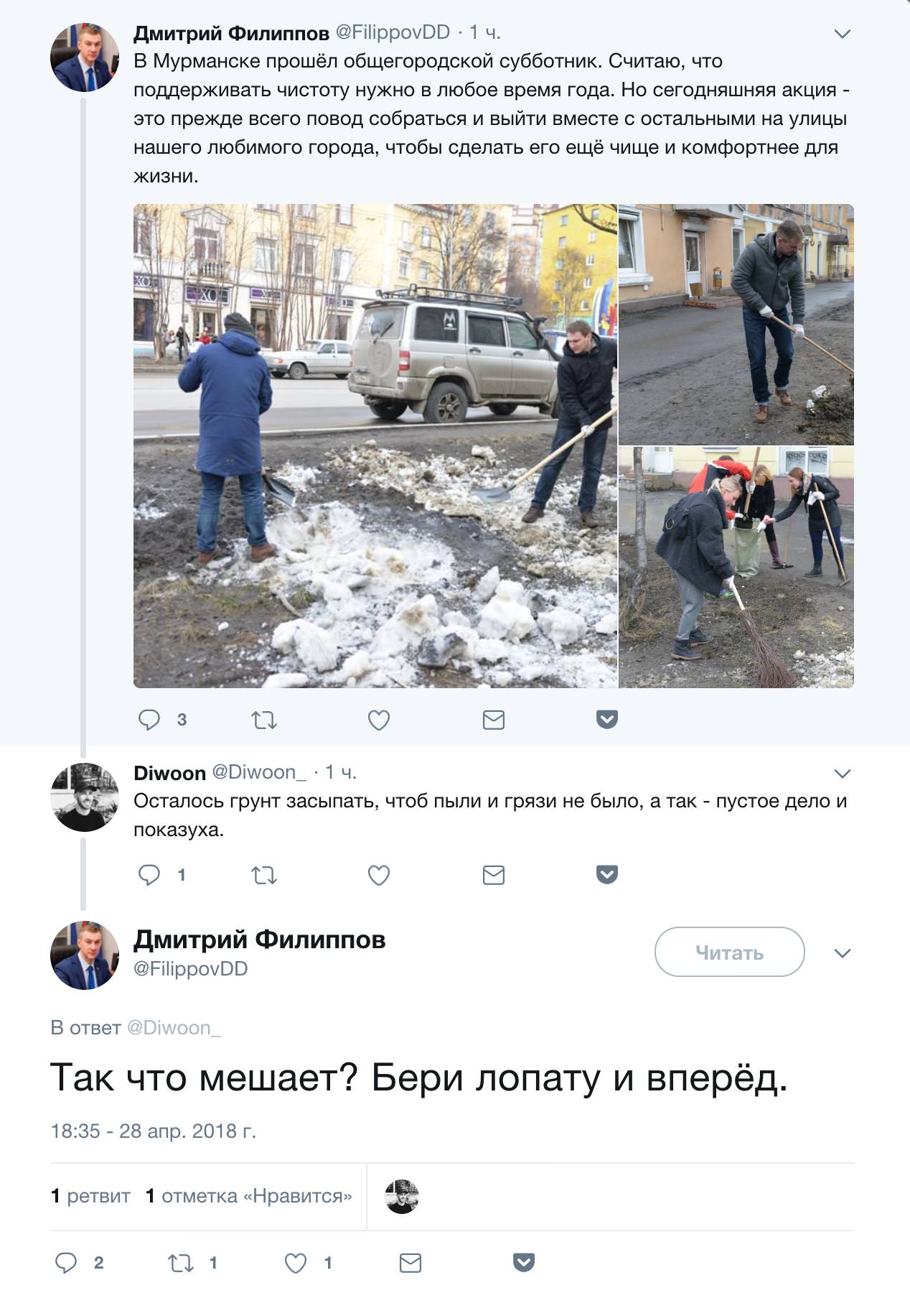 В ответ на справедливое замечание жителя о том, что все его действия — полная показуха, а грязь после такой уборки никуда не денется, мэр ответил настолько нагло, что дополнительные комментарии даже не нужны. 52-х летний Дмитрий Филлипов стал руководителем Мурманска пару лет назад. До этого дядя возглавлял сеть супермаркетов «Евророс». На свою должность он был назначен, его никто не выбирал, два года человек занимается непонятно чем, получает зарплату из муниципального бюджета. Уборка и поддержание территории в человеческом виде напрямую отнесена к вопросам местного значения, то есть входит в обязанности муниципального образования.