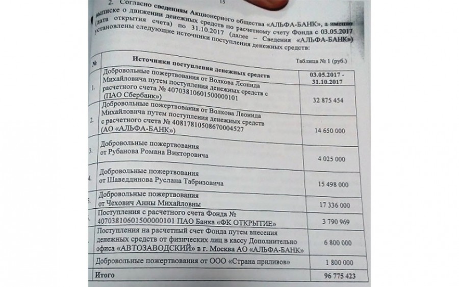 Ключевым документом, проливающим свет на механику финансирования и поступления денежных средств на счета фонда, является банковская выписка по движению средств на счетах "Пятого времени года". Как оказалось, с 3 мая 2017 года по 31 октября 2017 года в распоряжение фонда поступило порядка 96 миллионов рублей пожертвований.