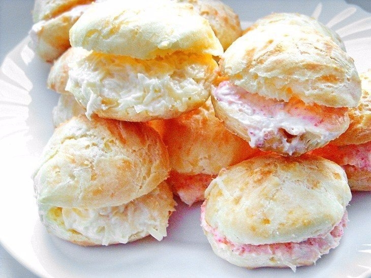 10. Часть булочек я наполнила сыром, натертым на терке, смешанным с раздавленным через пресс чесноком и майонезом. А вторую часть булочек начинкой из консервированной семги (жидкость слить, а рыбу размять вилкой), смешанной с икрой мойвы и творожным сыром.