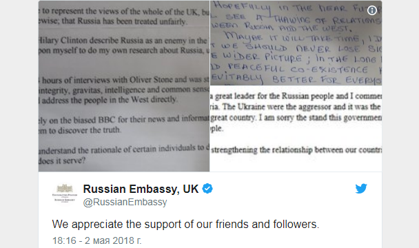 «Посмотрев четыре часа интервью Оливера Стоуна, я был поражен прямотой, авторитетом, интеллектом и здравым смыслом Путина. Хотелось бы, чтобы он мог обращаться к людям на Западе напрямую», – приводит РИА «Новости» текст одного из писем опубликованных российским посольством. Другие британцы отмечают, что их согражданам будет нелегко узнавать правду, пока они доверяют «предвзятым Би-би-си».