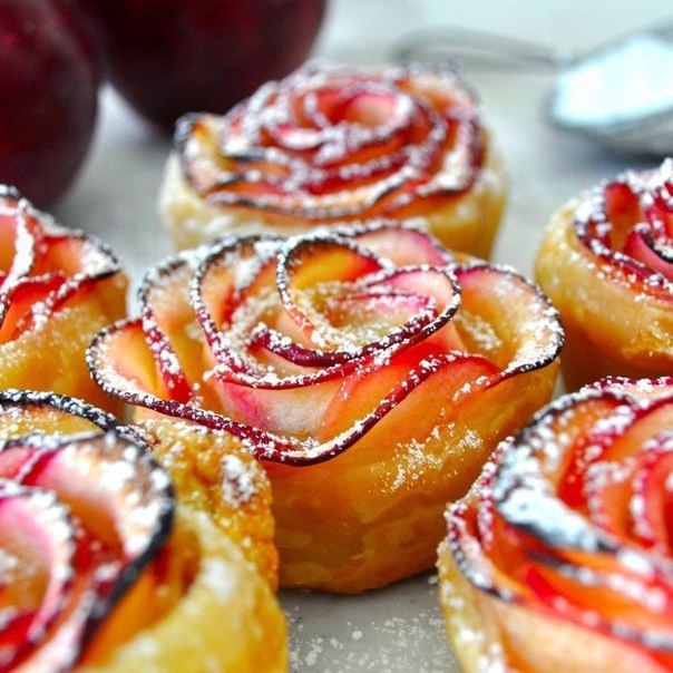 6. Раскатываем тесто, нарезаем полосками, смазываем джемом, раскладываем яблоки, можно присыпать корицей. И скручиваем.