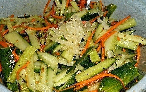 3.смешиваем порезаные огурцы и потертую морковку.