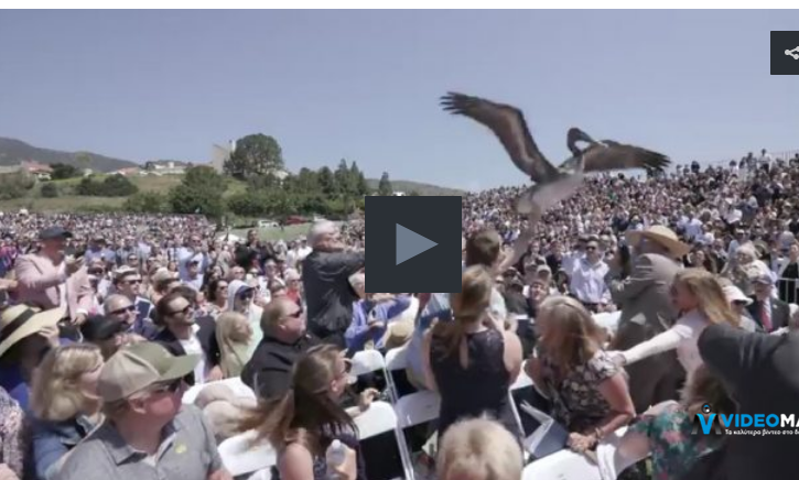 Это произошло в Калифорнии в Университете Пеппердайн на церемонии вручения дипломов. Сначала пеликаны пролетели над собравшимися, затем они буквально спланировали на головы людей.