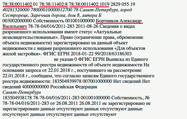 «Полный тезка директора ФСБ России, владел 28 сотками по адресу Заречная дорога, дом 8, литера б. Кадастровая стоимость земельного участка и зарегистрированных на нем помещений – более 48,6 млн рублей. Рыночная стоимость земельного участка подобной площади в районе Сестрорецка может составлять порядка 200-300 млн рублей», – пишет Зобова.