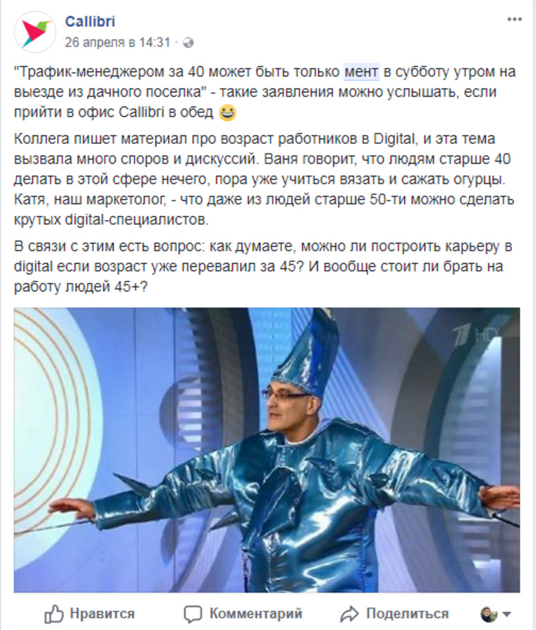 «Малоизвестное нашему коллективу дыжотал-агентство „Кал и бри“ немножечко развело эйджизм в своем фейсбуке. Выйдя с урока алгебры, юная SMM-фея агентства написала оригинальный пост, который начинается так: „Трафик-менеджером за сорок [лет] может быть только мент в субботу утром на выезде из дачного поселка“ — такие заявления можно услышать, если прийти в офис Callibri в обед». А из комментариев к тому же посту выясняется, что люди «ближе к пятидесяти не только не умеют в трафик и контекст: они еще плохо разбираются в том, что такое Сафари и Ворд», — сообщается в одном из постов канала (орфография и пунктуация авторов сохранена, прим. Ред).