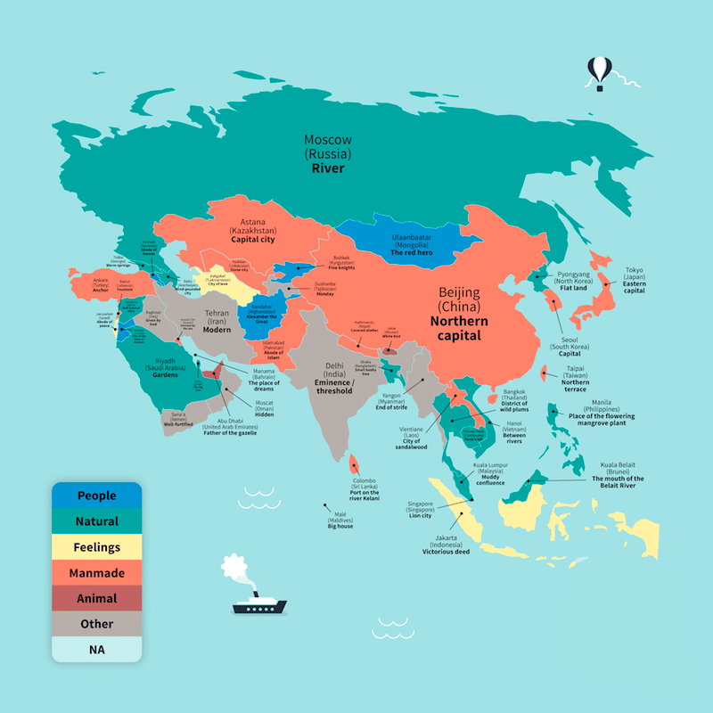 Например, Осло превратился в «Луга богов», а Бангкок — в «Край диких слив». Рига оказалась «Кладовой», Дублин — «Черным бассейном», Москва — «Рекой», австралийская столица Канберра — «Местом встречи».