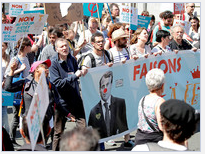 В целом манифестация проходит спокойно. Манифестанты, многие из которых пришли на митинг с семьями, организованными колоннами идут по улицам города. В руках они держат плакаты, гласящие - "Нет" - президенту богатых", "Все едины", "Нет" - социальному перевороту", "Альтернатива существует".