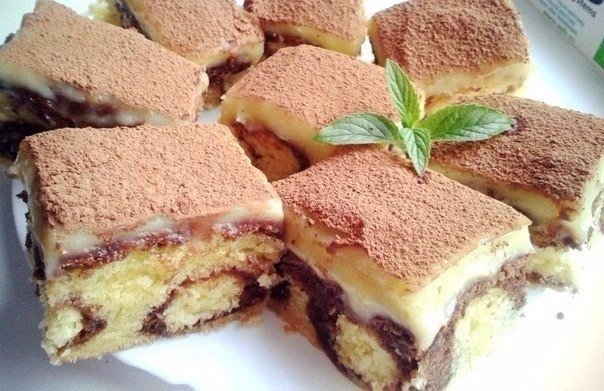 14. На остывший пирог выложить заварной крем и обсыпать порошком какао.