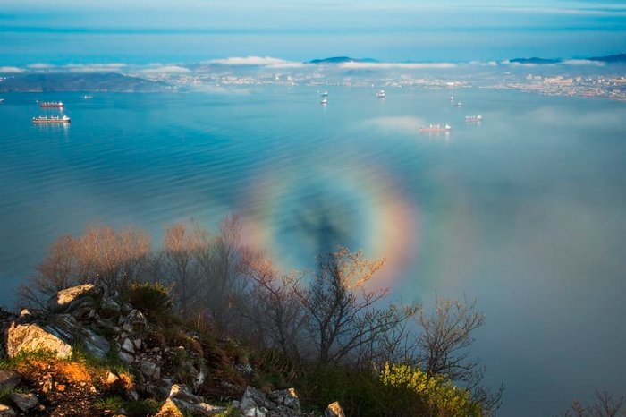 «Я приехал в Находку, чтобы отснять виды с сопки Сестра. Проведя целый день на вершине, мне удалось поймать хороший свет, не смотря на непогоду и дождь, но хороших фотографий было недостаточно, и я решил заночевать под сопкой, чтобы встретить рассвет. Наутро, поднявшись на гору, я увидел лишь плотную облачность без единого проблеска света. Просидев на вершине около часа, я уже смирился с тем, что не сделаю хороших кадров и собирался спускаться, когда неожиданно тучи стали разбегаться и выглянуло солнце. И тут я увидел свою искажённую тень, падающую на облака, а вокруг неё радужный ореол, напоминающий радугу. Он то исчезал, то вновь появлялся, в зависимости от плотности облаков. Зрелище было незабываемое! Подобное я видел пару лет назад во время моего перехода между двух вершин Снежной и Облачной, но тогда это было не так ярко и близко», - рассказал Виталий РИА VladNews.