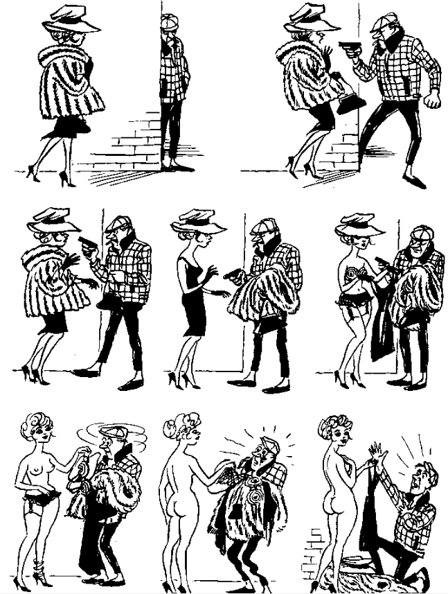 Шла одна домой мадам, в шубке с редикюлем. Вдруг из за угла грабитель, пистолет наставил ! Отдавай богатство; редикюль и шубку. Что уж, всё снимаю! И ритузы тоже - покраснел грабитель и влюбился тут же ! Руку ей и сердце и пистоль в придачу, И увёз он эту модмозель на дачу 😍