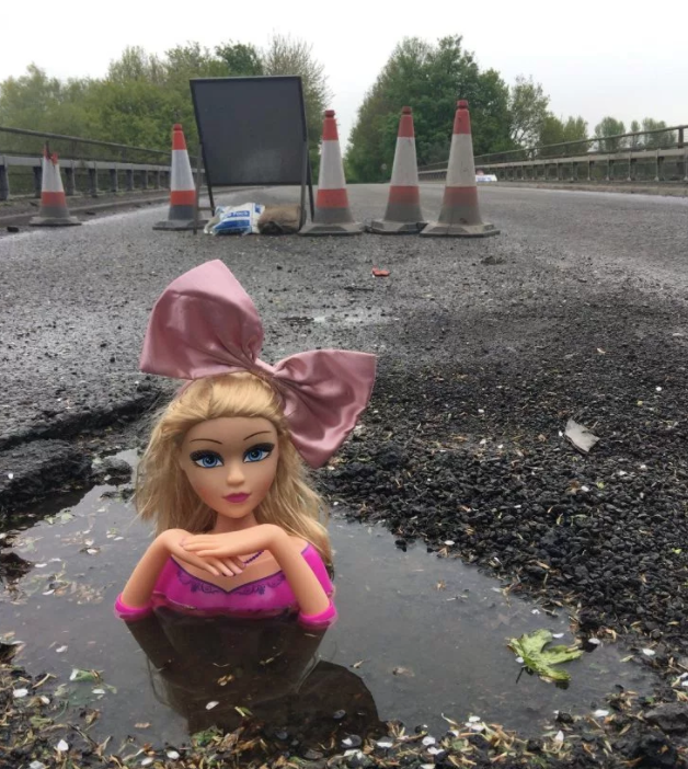 Он купил в благотворительном магазине несколько кукол — исключительно блондинок — и наполовину воткнул их в ямы. По его словам, игрушки обратят на себя внимание автомобилистов и мотоциклистов и предотвратят количество несчастных случаев.