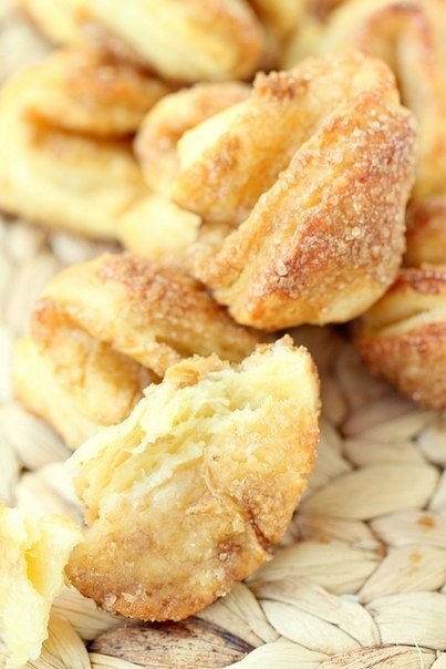 4. Насыпать в мисочку сахар и макать в него кружки теста. Затем сложить кружок пополам (сахаром внутрь). Еще раз сложить полукруг пополам и снова макнуть верхней стороной в сахар.