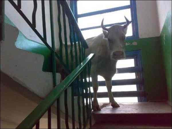 Корова на лестнице? Ну наверное в лифт она просто не влезла.