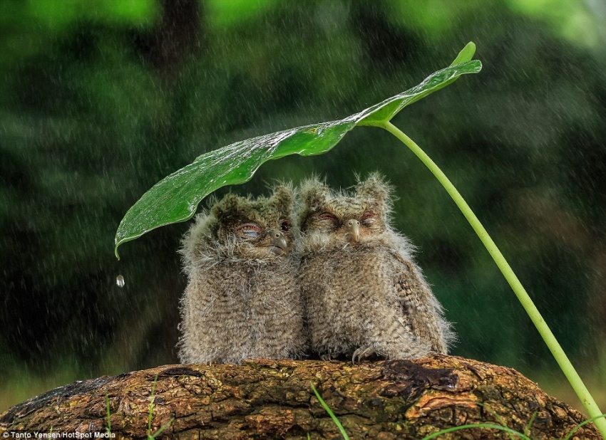 Фотограф Танто Йенсен отправился снимать в парк неподалеку от своего дома в Джакарте и, когда начался дождь, поспешил домой. Но внезапно заметил сидящих на ветке совят, которые прижались к друг дружке и словно зонтик использовали небольшой листик. Фотограф решил запечатлеть их. Снимки оказались по настоящему уникальными. — "Они выглядели такими милыми, я просто не мог пройти мимо. Я сам промок до нитки, но оно того стоило", — говорит Танто Йенсен.
