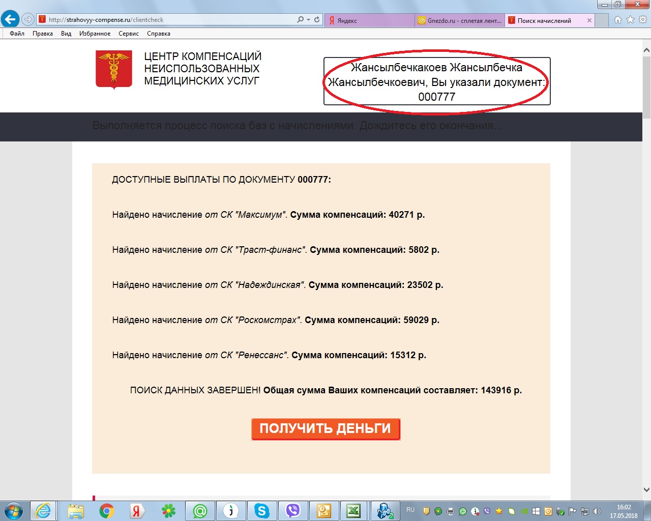 Вот один из современных "модных" разводов. Тема: "Скверное государство, которое нас не лечило, хотело замышить не использованную кучу денег, но добрые очень страховые компании решили вернуть их народу". Предлагается ввести фамилию, имя, отчество и последние шесть цифр номера полиса или паспорта (не сложно сообразить, что могут быть тысячи совпадений). Выбираю довольно не реальное сочетание Ф.И.О. и цифр (в красном овале), очень надеюсь, что организма с таким сочетанием в природе нет. Однако... у жулья есть! Мне объявляется возврат приличной суммы от различных страховых компаний.