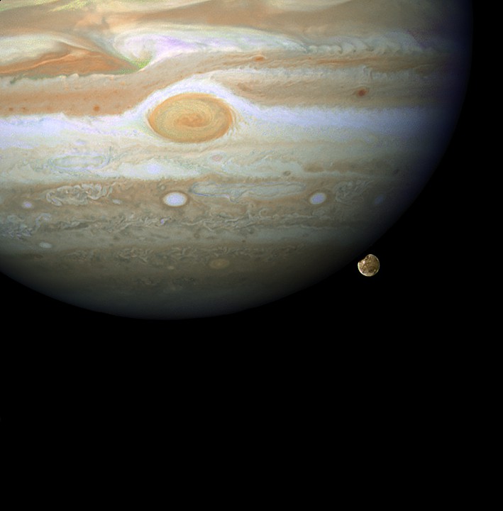 Спутник Юпитера, Ганимед, показан в тот момент, когда он начинает скрываться за гигантской планетой. Состоящий из каменистой породы и льда спутник - самый крупный в Солнечной системе, даже больше планеты Меркурий.