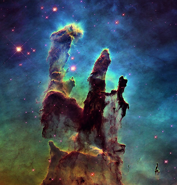 Столпы творения находятся в Туманности Орла. Они состоят из звездного газа и пыли и расположены в 7 000 световых лет от Земли.