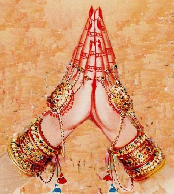 Приветствуя равного себе, в индийской традиции принято складывать ладони у груди (от всего сердца). Приветствуя важного господина или учителя, следует сложить ладони у лица (что значит, что вы склоняетесь перед ним и телом, и сердцем, и умом). Приветствуя Гуру или Бога, следует сложить ладони над головой, принося ему все уровни своего существа.