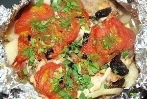 1. На фольгу уложить: порезанный картофель лук репчатый порезанный кольцами рубленный куриный окорочок чеснок (мелкие кусочки) чернослив (мелкие кусочки) измельченные грецкие орехи помидоры кружочками посолить, поперчить.