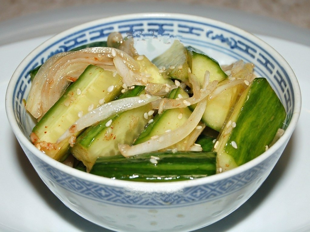 Для приготовления вам понадобится: огурцы свежие - 1 кг; лук репчатый - 1 шт. (не обязательно!); чеснок - 3 дольки; соль - 1 ч. л.; соевый соус - 2 ст. л.; уксус - 2 ст. л.; острый красный перец сушеный - 0,5 ч. л. (или по вкусу); кунжутное масло - 5 ст. л.; сахар - по желанию и по вкусу (не обязательно!); кунжутное семя - 1 ст. л.