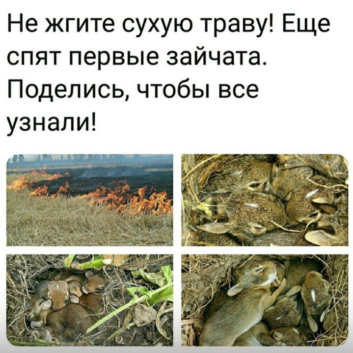 7) Выжигание сухого травостоя вызывает гибель кладок и мест гнездовий таких птиц как кряква, чирок-трескунок, чибис, травник, бекас, камышовая и обыкновенная овсянки, полевой, лесной и хохлатый жаворонки, луговой конек. Гнездовой период этих птиц начинается в начале апреля. С выжженных мест птицы уходят, а значит уходят и от нас. Животные и птицы очень боятся огня.