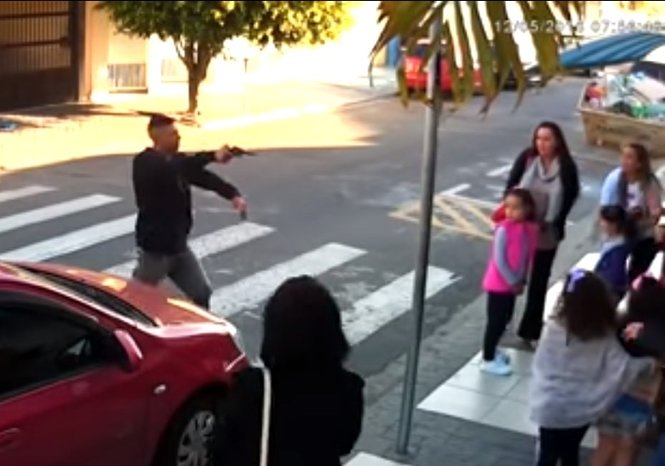 Сцена, достойная крутого голливудского боевика, развернулась на тихой улочке бразильского Крузейру-ду-Сул. Пишем со слов портала Globo. По магическому совпадению, дело было в День матери, 13 мая. Стоит, значит, группа этих самых матерей с детьми возле колледжа Ferreira Master, ждет открытия, никого не трогает, как вдруг подлетает к ним 21-летний парень, наставляет на них пистолет 38-го калибра и пытается, судя по видео, выхватить у кого-то из женщин сумку!
