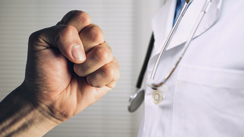 Скорее всего на почве болезни мужчина вёл себя не совсем адекватно, но успокоительного никто не догадался предложить, а потом поговорить с ним, вот и результат встречи с медиками!Уж не знаем, как себя с ним вели медики, судить сложно!Но, что много людей нуждается в психологической помощи, а кто и в психиатрической, пора уже это признать!Потому что жизнь не сахар, многих не балует, люди очерствели, стали грубыми, есть шутят так, а есть на хамство отвечают хамством!Человек заболел и не нужен ни больнице, ни на работе, а получая копеечные зарплаты восстаёт против условий, унижающих его честь и достоинство!Потому так часто стали люди вести себя!А нашим доблестным органам остаётся людей карать, они ничего не могут изменить в нашем обществе, хотя, если хорошо подумать, то можно всем стать чуточку человечнее и на пол тона ниже разговаривать, обследовать человека и лечить не так сложно, как кажется!Если нуждается в больничном, то не выбивать деньги с человека, а просто выписать больничный!Скорее всего с такой проблемой и столкнулся гражданин, а если заболевание так прогрессирует, что человек не может работать, то дать инвалидность, и не выбивать деньги!Сколько таких случаев из-за того, что деньги поставлены на кону, к люди умирают, но наши медики не поколебимы, за койко-иесто-плати, за лечение-плати, за больничный-плати, за инвалидность-плати, нет денег-умирай!!!Вот, когда такое отношение прекратится в обществе, люди стануь добрее!А была бы достойная оплата работы, могжет человек взял бы в крайнем случае за свой счёт, что бы не покупать больничный и прочее или пошёл вдругую больницу, где его культурно бы обслужили, а без денег -только умирать!!!