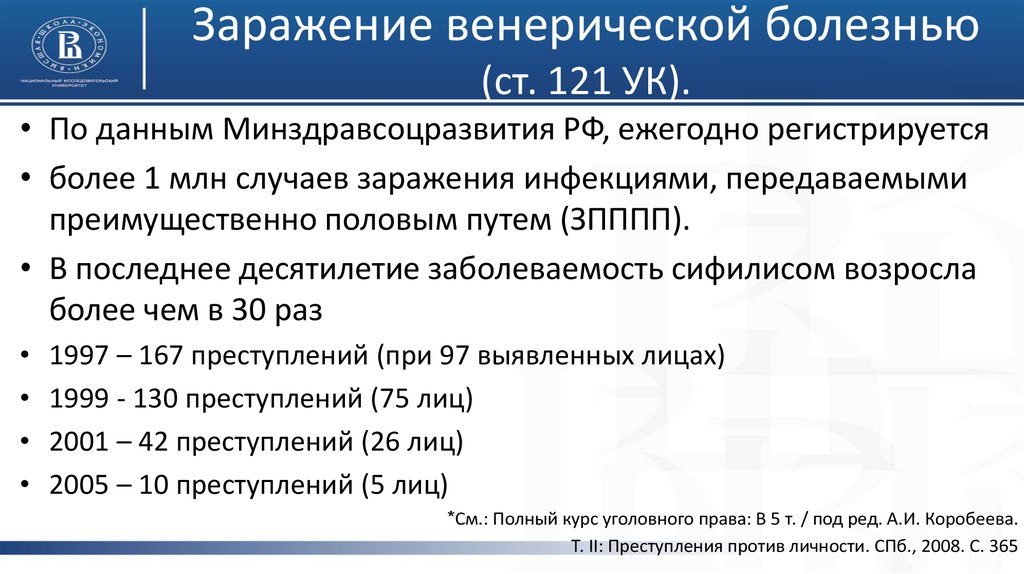 В минувшем 2017 году в соответствии со статьей 121 Уголовного кодекса «Заражение венерической болезнью» было зарегистрировано пятнадцать преступлений. Соответствующие данные RT предоставили в Министерстве внутренних дел России. Отмечается, что в 2012 году зафиксировано 11 таких преступлений. В ведомстве добавили, что в 2017 году предварительно расследовано пять преступлений по статье, в 2012 году — семь. Согласно ст. 121 УК, человека могут наказать, если заразивший знал о наличии у него венерической болезни. Среди максимально возможных наказаний по статье — лишение свободы на два года или штраф в размере 300 тыс. рублей. Ранее в МВД заявили, что в России число зарегистрированных преступлений, предусмотренных ст. 122 УК «Заражение ВИЧ-инфекцией», увеличилось на 75%.