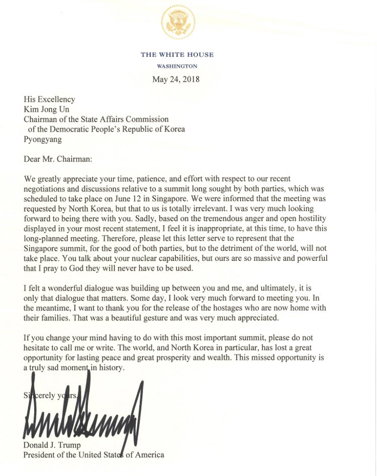 "Настоящим письмом извещаю Вас, что Сингапурский саммит не состоится", – говорится в тексте документа. "На благо обеих сторон, но в ущерб миру", - отмечается в нём.
