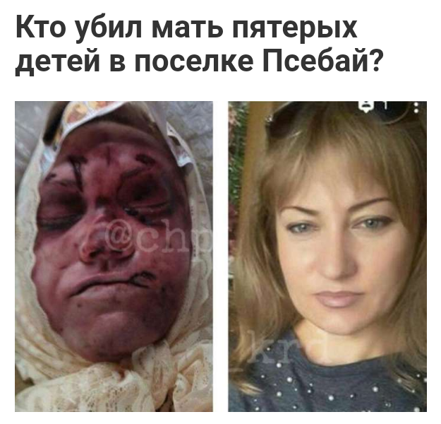14.05.2018 Поселок Псебай Краснодарского края: возвращаясь домой после встречи с родственницей в кафе, мать пятерых детей (младшему 2 года, старшему-20) превращена толпой пьяных отморозков в кусок мяса забавы ради. Погибшая была замужем, семья - благополучная. Местные газеты умалчивают чудовищные подробности зверского убийства, а полиция покрывает преступников. Но благодаря интернету эта история вышла наружу и получила широкий резонанс.