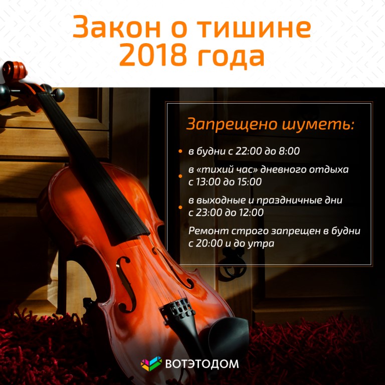 Закон о тишине гласит, что нельзя производить резкие шумы: с 21 вечера до 07 утра в официально рабочие дни; с 22 вечера до 10 утра в официально праздничные и выходные дни; с 13 до 15 часов дня в любой календарный день.