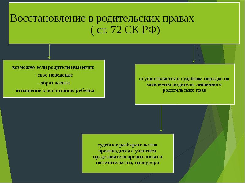 Порядок восстановления родительских прав предусмотрен статьёй 72 Семейного кодекса Российской Федерации. Родители (один из них) могут быть восстановлены в родительских правах в случаях, если они изменили поведение, образ жизни и (или) отношение к воспитанию ребёнка. Восстановление в родительских правах осуществляется только в судебном порядке по заявлению родителя, лишённого родительских прав. Дела о восстановлении в родительских правах рассматриваются с участием органа опеки и попечительства, а также прокурора. Одновременно с заявлением родителей (одного из них) о восстановлении в родительских правах может быть рассмотрено требование о возврате ребёнка родителям (одному из них). Следует иметь ввиду, что суд вправе с учётом мнения ребёнка отказать в удовлетворении иска родителей (одного из них) о восстановлении в родительских правах, если восстановление в родительских правах противоречит интересам ребёнка. Восстановление в родительских правах в отношении ребёнка, достигшего возраста 10 лет, возможно только с его согласия. Не допускается восстановление в родительских правах, если ребёнок был усыновлён и в последующем усыновление не отменено. В течение трёх дней со дня вступления в законную силу решения суда о восстановлении в родительских правах суд направляет выписку из своего решения в орган записи актов гражданского состояния по месту государственной регистрации рождения ребёнка.
