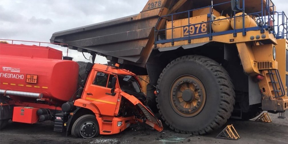Ну, водитель БелАЗа не заметил КамАЗ, а водитель КамАЗа куда смотрел? На девушку, что за рулем БелАЗа? Девушка наверняка не пьет, солярку не продает, а глазки строит, вот и результат.