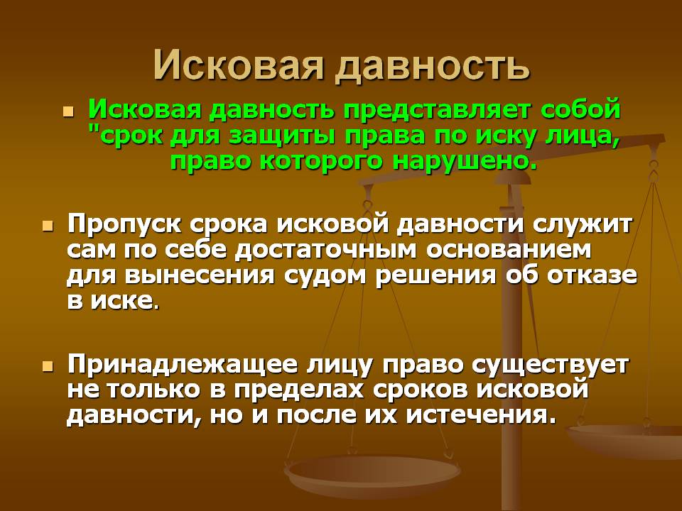 Исковая давность — это срок, отведенный для защиты нарушенного права. Срок, в течение которого лицо, считающее, что его права нарушены, может обратиться в суд за защитой (ст. 195 Гражданского кодекса РФ). Это не означает, что если срок давности истек, то человек лишается права на судебную защиту. Гражданин по-прежнему вправе обратиться в суд, и иное будет означать нарушение одного из основных прав, гарантированных Конституцией Российской Федерации. Суд примет иск, даже если срок давности истек — он обязан это сделать, рассмотрит дело по существу, но рассмотрение будет недолгим: до того, как ответчик не заявит об истечении сроков давности. После того как суд получит заявление об истечении сроков давности, он должен будет вынести решение об отказе в иске (ст. 199 ГК РФ). Закон предоставляет возможность восстановить пропущенный срок, но в редких случаях. Так, пропущенный срок может быть восстановлен, если: суд признает причины пропуска уважительными по обстоятельствам, связанным с личностью истца (его тяжелая болезнь, беспомощное состояние, неграмотность), и эти уважительные причины имели место только в последние шесть месяцев срока давности (или в течение срока давности, если он равен шести месяцам или менее шести месяцев). Под неграмотностью следует понимать неумение читать и писать, а не неосведомленность в правовых вопросах. Общий срок исковой давности составляет три года (ст. 196 ГК РФ) — по общему правилу с того дня, когда лицо узнало или должно было узнать о нарушении своего права и о том, кто является надлежащим ответчиком по иску о защите этого права. При этом срок исковой давности не может превышать 10 лет со дня нарушения права, для защиты которого этот срок установлен, за исключением случаев, установленных Федеральным законом от 06.03.2006 N 35-ФЗ «О противодействии терроризму». Срок исковой давности для некоторых видов требований может быть больше или меньше трех лет. Например, срок исковой давности составляет: