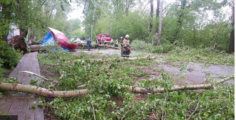 В воскресенье днем в Кирове прошла сильная гроза с порывистым ветром, который валил деревья. Одно из них упало на остановку, пострадали два человека. Повреждения получили многие автомобили и здания.