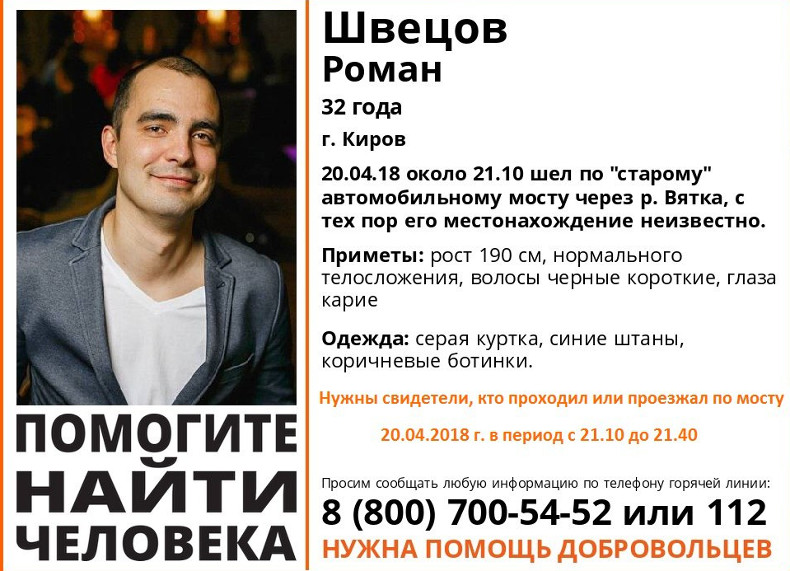 20 апреля вечером 32-летний Роман ушел из дома. Согласно данным с камер видеонаблюдения, установленных на улице Профсоюзной, видно, как он идет по направлению к Старому мосту в сторону Заречного парка, в 21.07 входит на его правую пешеходную часть и выходит за пределы видимости видеокамеры. С этого момента о его местонахождении было ничего не известно.