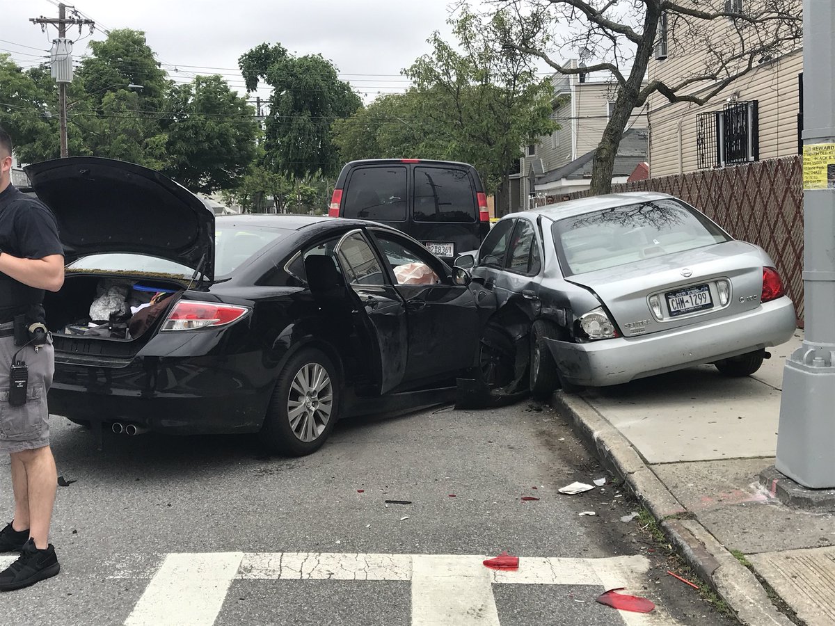 "Смертельная стрельба в South Ozone Park в Куинсе привела к этой аварии с участием нескольких авто. Три человека в черном седане могут быть причастны. Розовый пистолет найден поблизости".