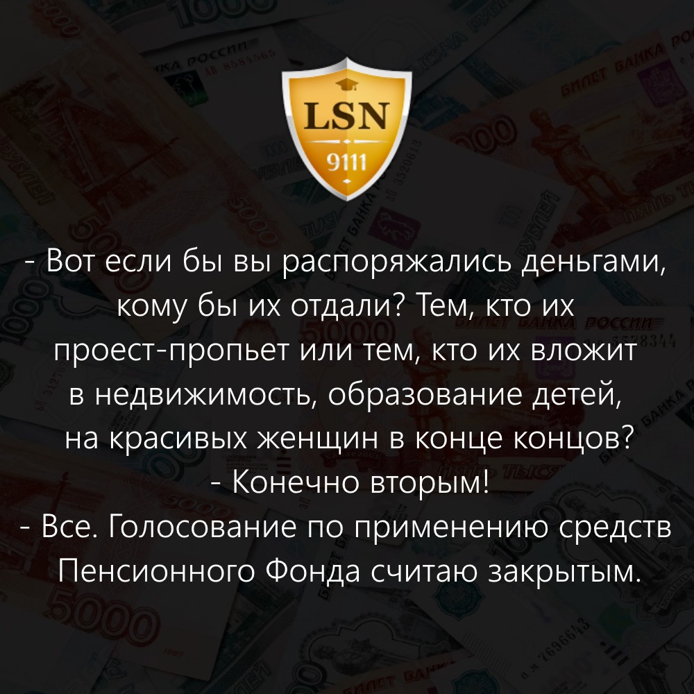 -Вот если бы вы распоряжались деньгами, кому бы их отдали? Тем, кто их проест-пропьет или тем, кто их вложит в недвижимость, образование детей, на красивых женщин в конце концов?