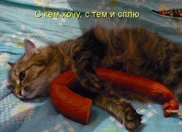 Запас душу греет , вот и спит с колбасой спокойно, а глаза то открыты - наблюдает , чтобы не сперли..