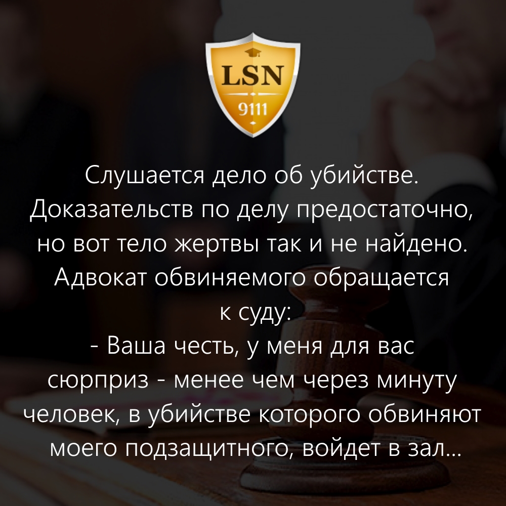 - Ваша честь, у меня для вас сюрприз - менее чем через минуту человек, в убийстве которого обвиняют моего подзащитного, войдет в зал суда.