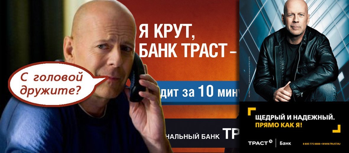 В конце 2011 – начале 2012 года на улицах Петербурга появились постеры с изображением «крепкого орешка» Брюса Уиллиса, логотипом банка TRUST («ВЕРЬ!») и слоганом «Он такой же надежный, как и я». Ну как можно на это не купиться? Многие поверили…