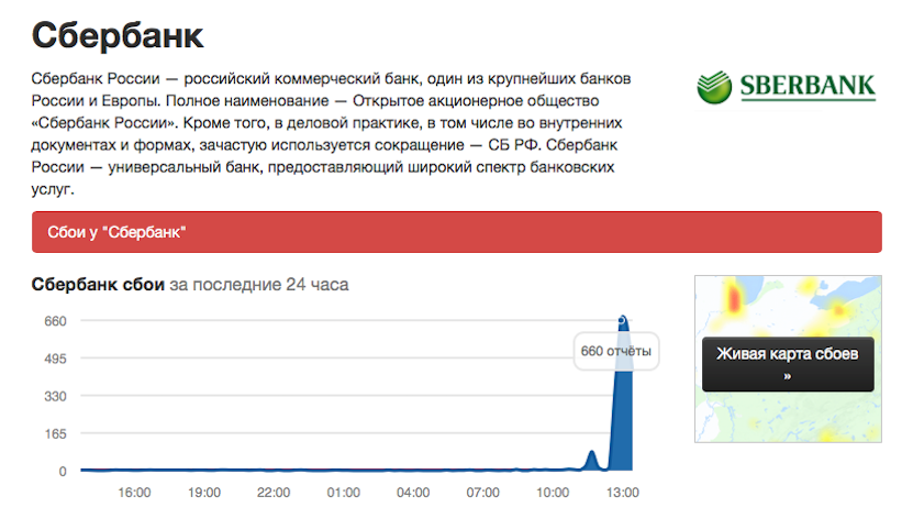 Согласно данным сайта downdetector.ru на 13.45 16 июля 2018 года, порядка 43% клиентов банка по всей России не смогли получить выписку по счету, 40% не смогли войти в систему, оставшиеся 16% пожаловались на сбой в работе всех сервисов.