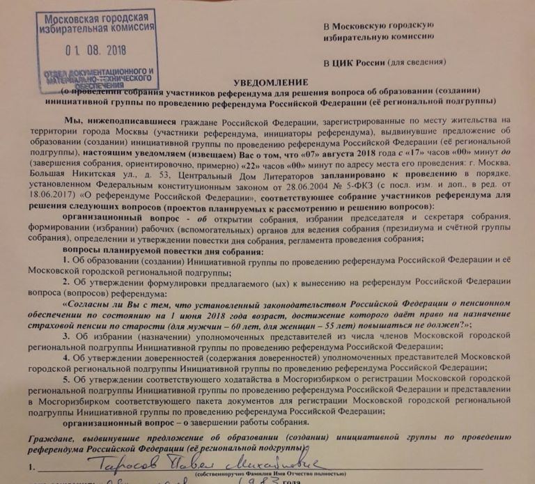 17 июля инициативная группа представителей КПРФ подала в Мосгоризбирком документы на проведение референдума с одним вопросом: "Согласны ли вы с тем, что в Российской Федерации возраст, дающий право на назначение страховой пенсии по старости, повышаться не должен?"