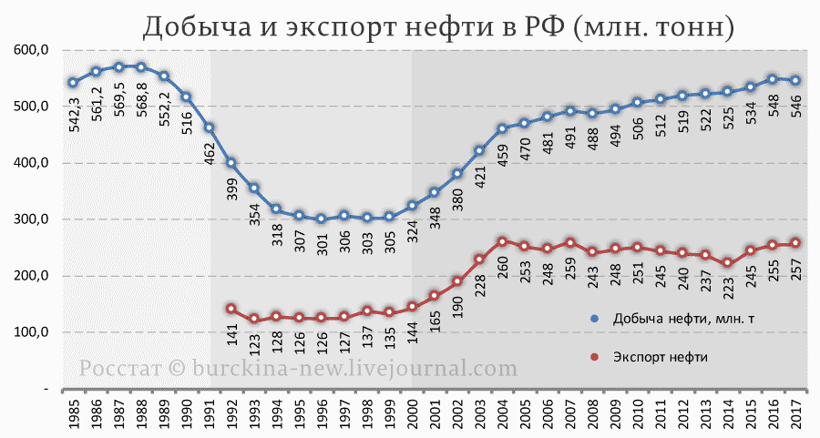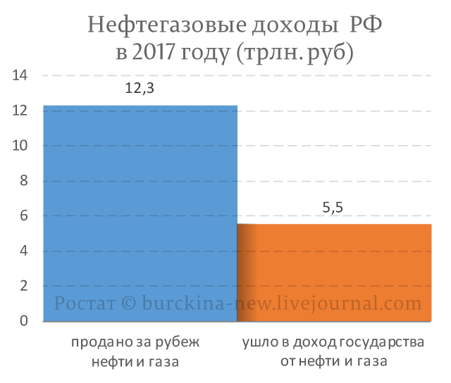 Слева проданные за рубеж нефть и газ в рублевом эквиваленте. Справа доход бюджета РФ от нефти и газа, который значительно меньше всех доходов олигархов.