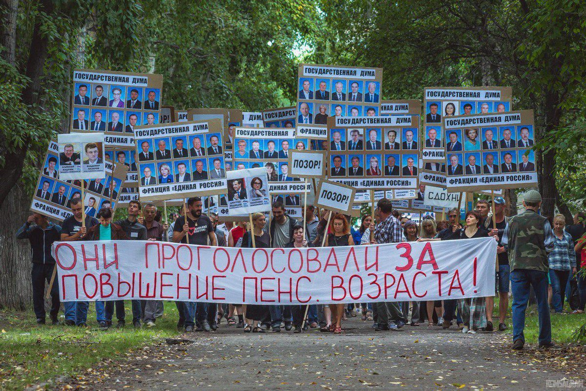 Протестующие прошли с портретами депутатов Государственной думы от партии «Единая Россия» и транспарантом «Они проголосовали за повышение пенсионного возраста».