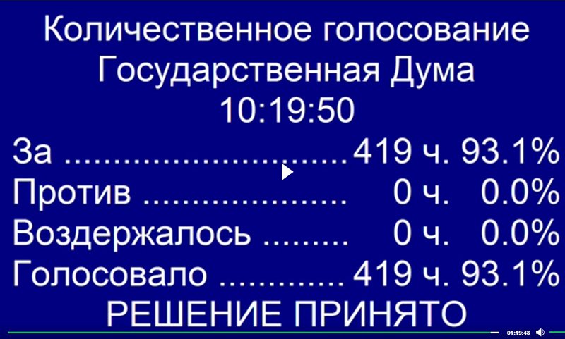 Публикация фейк для тупых и безмозглых, который проталкивают благодетели импортные - на изображении ЗА-419 чел. В итоге за законопроект в целом проголосовали 326 депутатов. Против были 59, воздержался один, всего голосовали 386. Такие данные показали на табло голосования, передает корреспондент Русской службы Би-би-си. Против проголосовали КПРФ и "Справедливая Россия", а 39 из 40 депутатов от ЛДПР не голосовали.