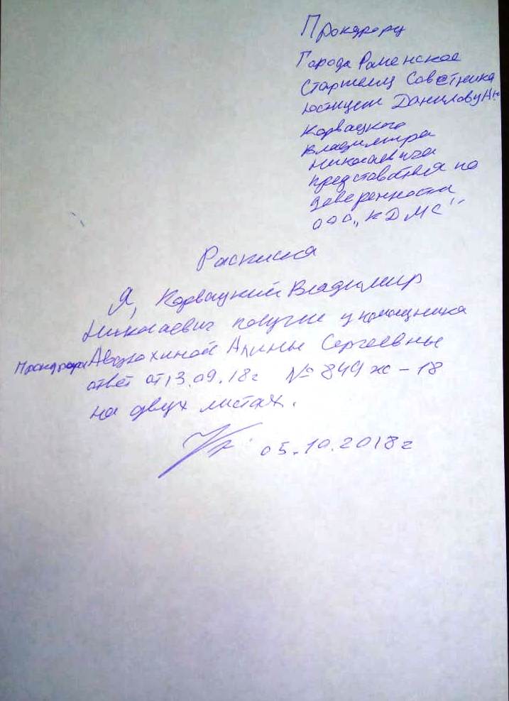 Моя расписка в получении ответа на Жалобу в Прокуратуре Города Раменское Московской области