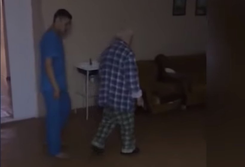 На одном из видеороликов под хохот коллег молодые санитары швыряют в престарелого больного тапочки, а напоследок дают пинок.