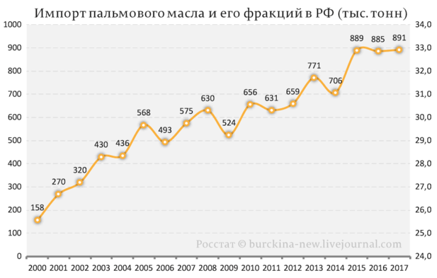 В 1990 году согласно сборнику «Внешняя торговля СССР» за 1990 год в весь СССР было импортировано 87,4 тыс. тонн пальмового масла и его фракций, а в РФ в 2017 году завезли 891 тыс. тонн.